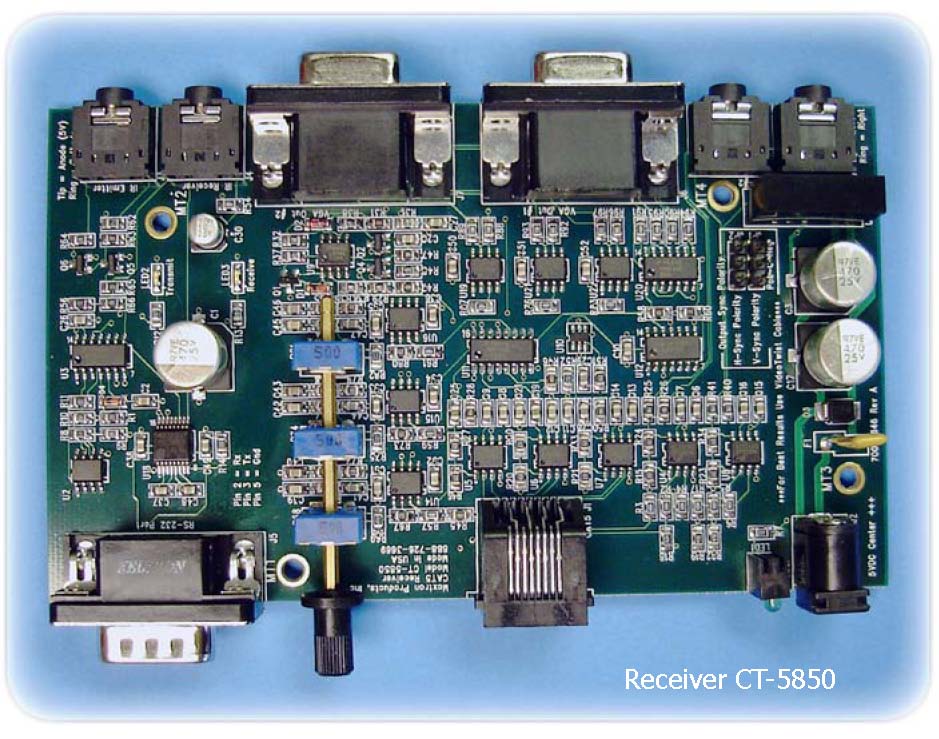 The Maxtron CT-5800/5850 CAT5 Transmitter/Receiver links stereo audio, RGBHV video, and RS-232 or IR between distant points using a single inexpensive CAT5/CAT5e/CAT6/7/8 UTP cable. These are very cost effective, third-generation products which utilize application specific linear devices to provide the fastest video rise times and pixel cycling possible over UTP cable. The CT-5800 Transmitter features loop-thru VGA and audio inputs, while the CT-5850 Receiver supports dual VGA monitors and dual stereo outputs eliminating breakout boxes and distribution amplifiers in many system configurations.