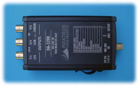 The Maxtron DA-5200 is a dual-rate universal 20/10-bit HD/SD SDI digital-to-analog converter with an in-line video processing amplifier. The DA-5200 integrates SDI sources into an analog video environment where a mix of analog and SDI sources is required. Applications include video monitors, disk recorders, broadcast production, nonlinear editing stations, and rental and staging events. For HD-SDI inputs, the DA-5200 outputs full bandwidth (SMPTE-274M) HD compliant YUV video with tri-level syncs or RGsB video, and for SD-SDI inputs, the DA-5200 outputs YUV video or RGsB video or composite and S-video. All broadcast HD and SD standards are supported, including ITU-R BT.601/ITU-R BT.656 (486i, 576i), SMPTE 293M (486p), ITU-R BT.1358M (576p), SMPTE 274M (1080i), SMPTE 296M (720p), or SMPTE 240M (1035i), all with automatic detection and configuration.