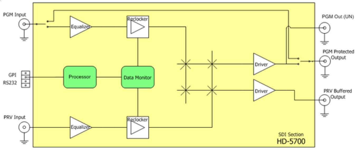 The HD-5700 offers unattended operation. It monitors the SDI and AES paths and automatically switches when the input signal is lost or becomes invalid based on a programmable set of input signal parameters. The main program (PGM) or the back-up input (PRV) signals can be automatically be routed to the primary program outputs (Protected) to ensure the delivery of a valid program output in the case of an input signal fault. The HD-5700 also provides two re-clocked primary outputs, and one re-clocked backup output. The program output is bypass relay protected and provides protection on the program path if power to the is lost. Optionally, the HD-5700 offers wired or wireless network control and monitoring.